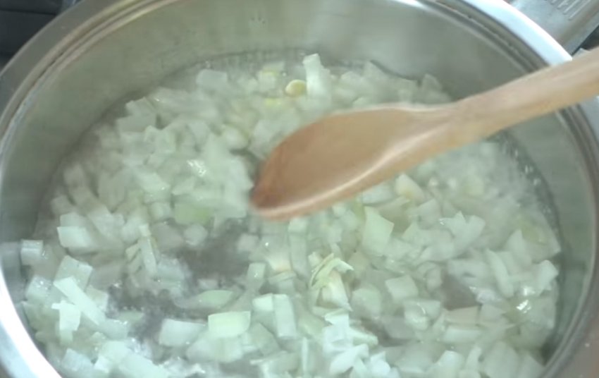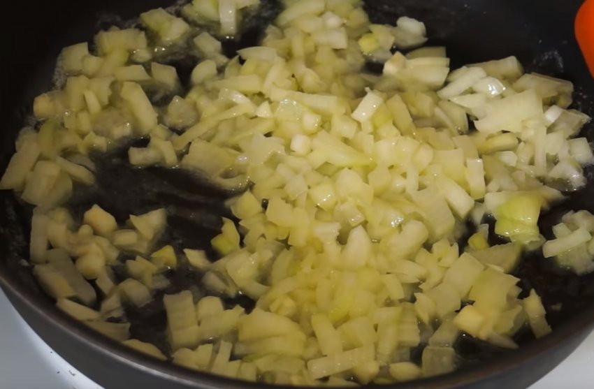 - Використовуйте керамічне покриття сковорідки, щоб нагріти оливкову олію, куди після цього насипте цибулю й обсмажуйте 5-7 хв. до прозорості.