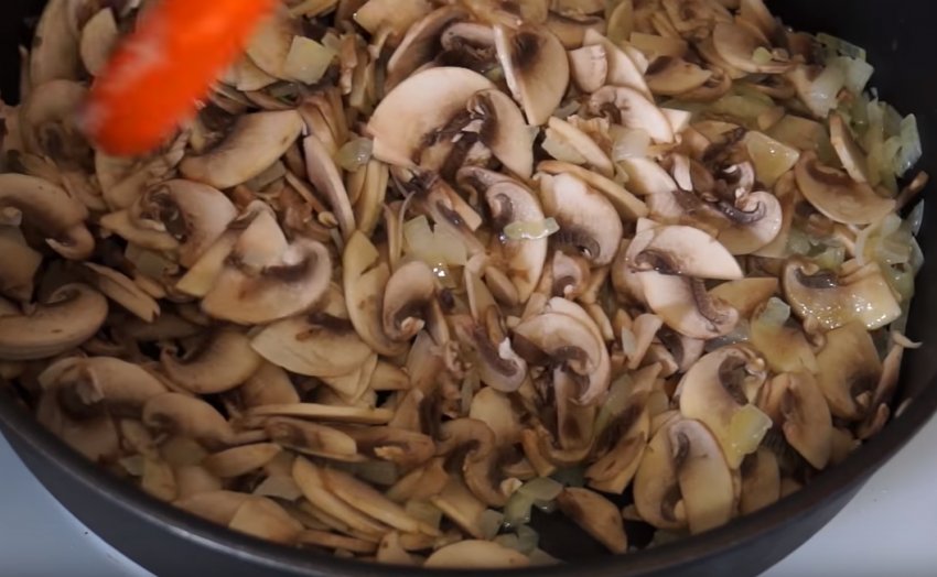 У готову цибулю додайте печериці. Обов'язково зменшіть вогонь.![]()