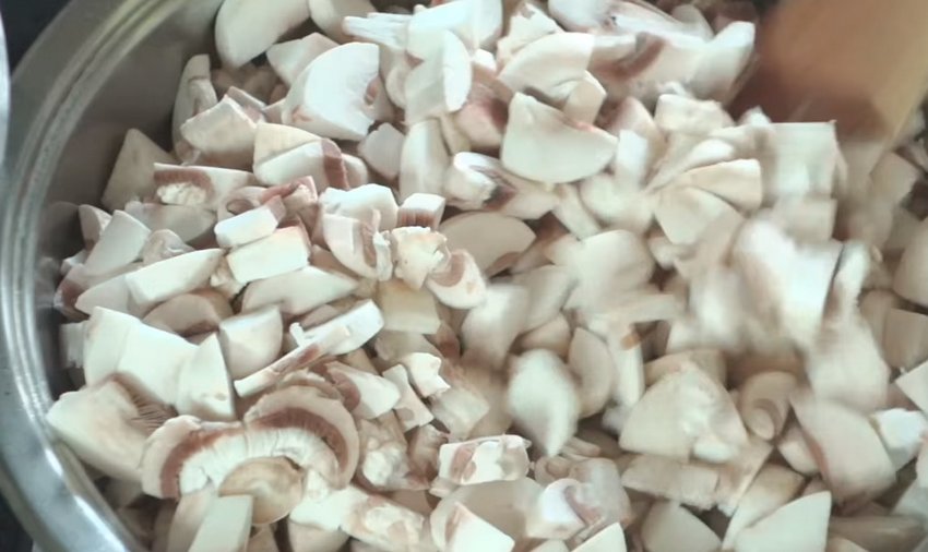 - Витягніть і відіжміть печериці. Їх слід подрібнити за допомогою гострого ножа.