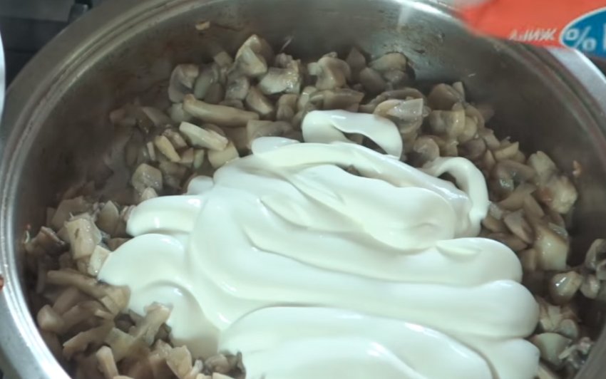 - Злийте грибний відвар, додайте в нього сметану, майонез, сіль, перець. Добре перемішайте до отримання однорідної маси.