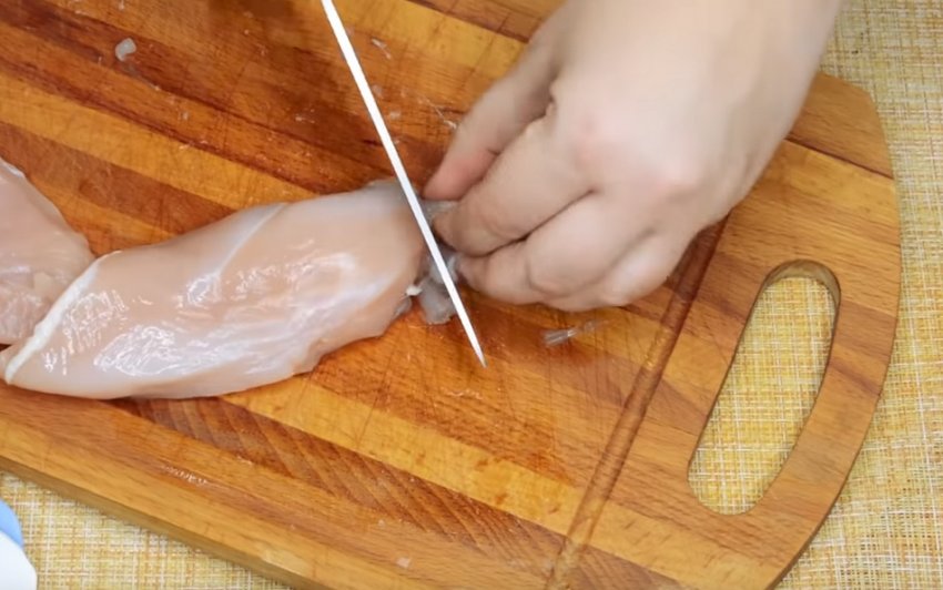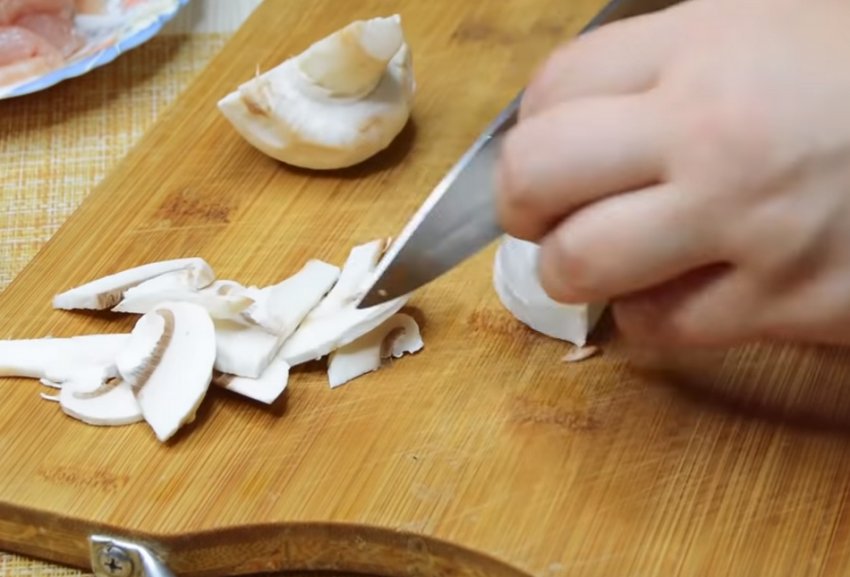 Підготовка інгредієнтів полягає в тому, що спочатку потрібно їх промити під чистою проточною водою. Це дасть змогу змити всі забруднення, пил або наявність інших ароматів (такі випадки виправдані тим, що на прилавках продукти лежать поруч з іншими товарами). Після промивання очистіть печериці від шкірки та обріжте нижню частину ніжки, де накопичується найбільше бруду. З курки видаліть плівку, яка є на поверхні. Якщо цього не зробити, то філе буде погано нарізатися.