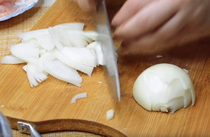 кубиками гриби та цибулю. Після закінчення 3-4 годин наріжте грудку соломкою або на свій розсуд.![]()