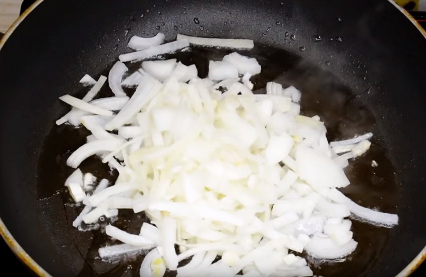на плиту сковорідку, налийте олію та розігрійте. Викладіть цибулю і смажте її близько 5 хвилин, постійно помішуючи. Вона має набути золотистого відтінку.![]()