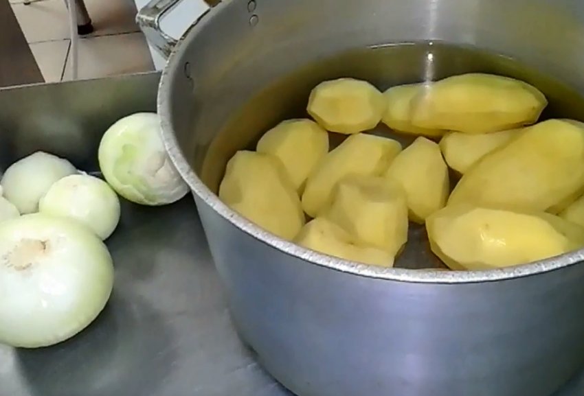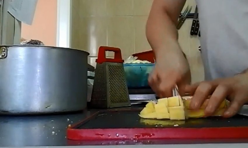 Середніми кубиками наріжте картоплю і висипте шматки в закипілу воду.![]()