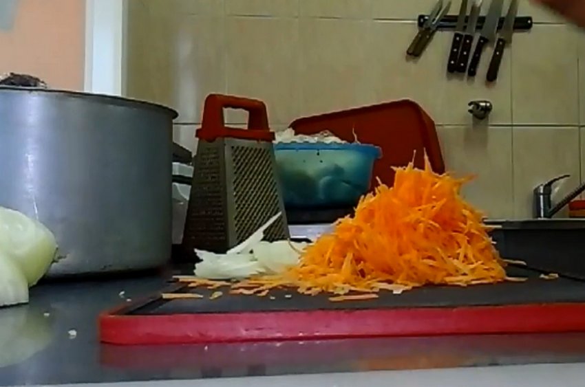 Наріжте соломкою цибулю і моркву (цибулю можна натерти на великій тертці), а потім обсмажте все в невеликій кількості рослинної олії, до прозорості цибулі.![]()