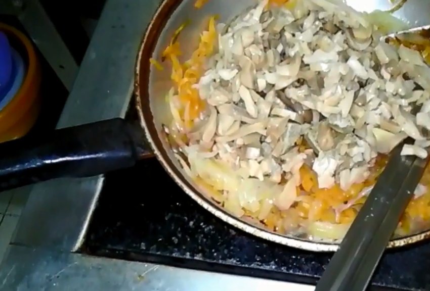 - Обсмажте їх до готовності (пасеруйте), спочатку виклавши на сковорідку цибулю, а потім додавши до неї і подрібнені гриби.