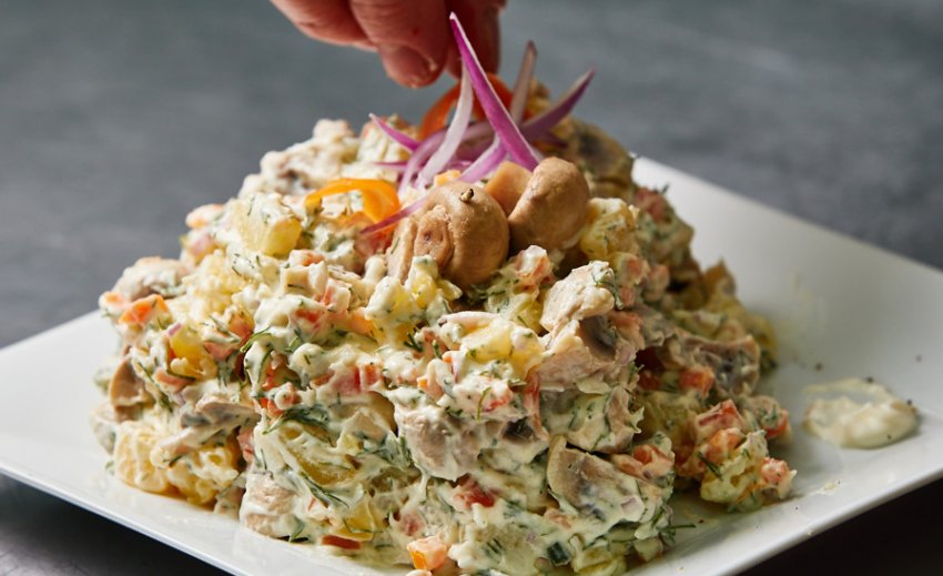 - Посоліть, поперчіть поверхню салату і добре змастіть усе майонезом.