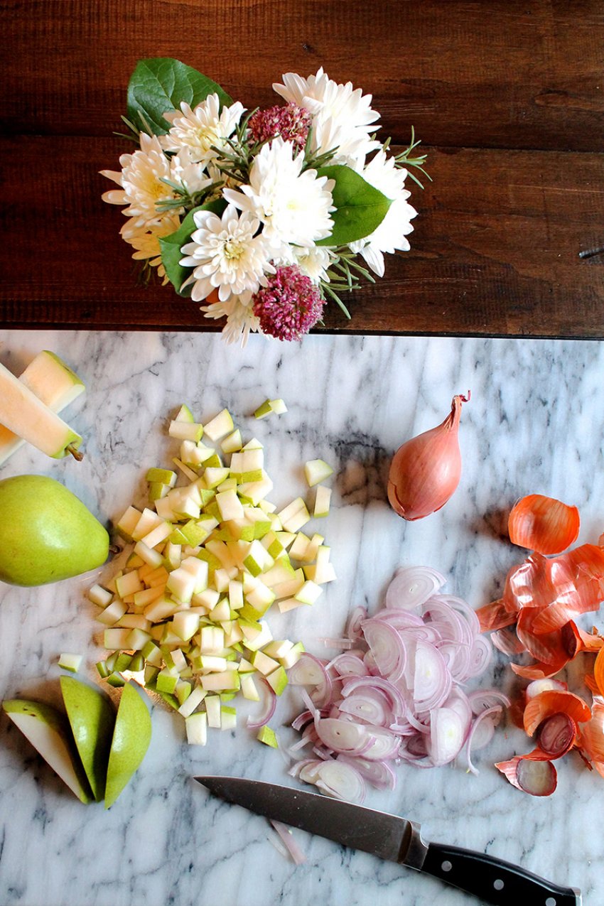 Розігріваємо духовку до 220 градусів. А поки вона нагрівається, нарізаємо кубиками груші, а цибулю шалот - тонкими пластинами.