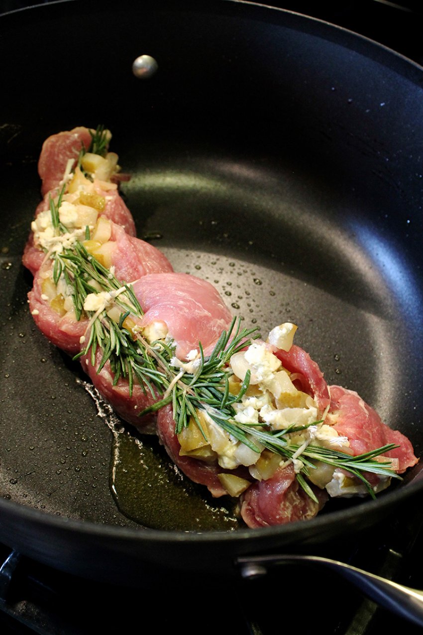 Поки груші киплять у вині, наріжте свинячу вирізку на два шари і надріжте кожен, не дорізаючи до кінця. У вас вийде своєрідна кишенька. У неї ми й "упакуємо" груші та цибулю шалот.