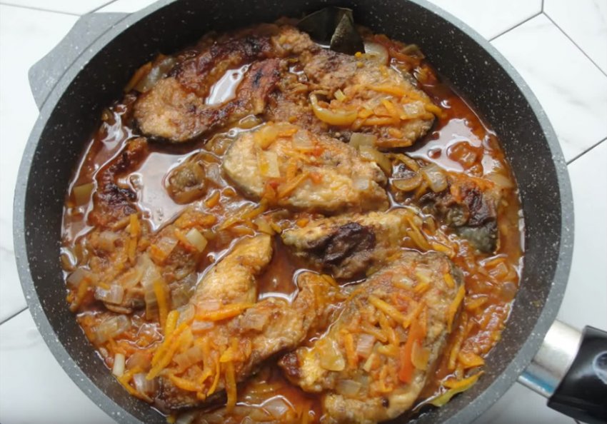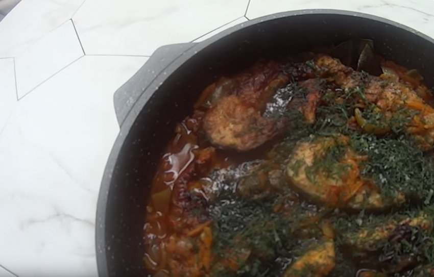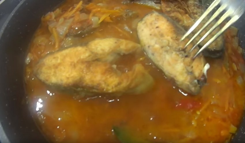 Обсмажені шматочки горбуші відправити до овочевої заправки. Протушкувати рибно-овочеву масу протягом 10-15 хв.![]()