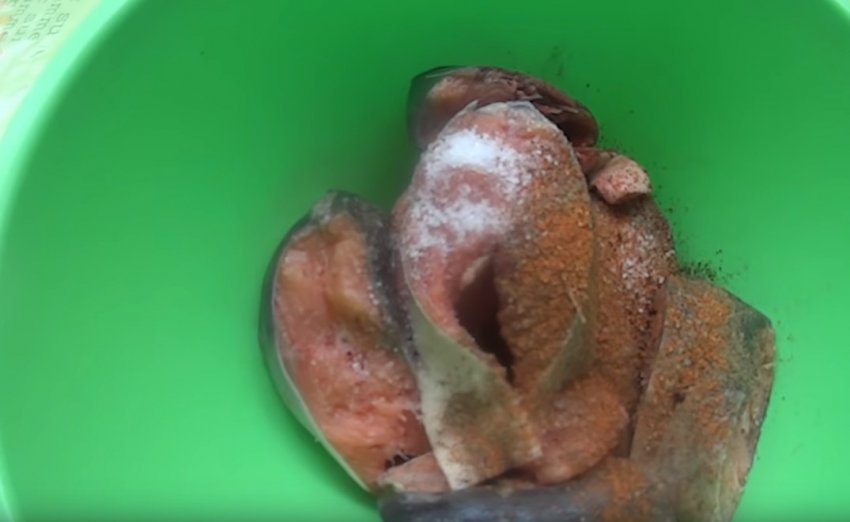 Рибу промити, звільнити від нутрощів, ще раз обполоснути водою.Нарізати головний інгредієнт довільними шматочками середнього розміру. Замаринувати, використовуючи перець і сіль.![]()