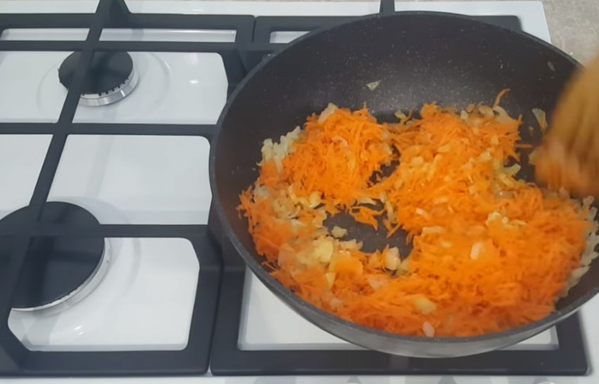 До цибулі закласти моркву, тушкувати ще 2 хв. У морквяно-цибулеву суміш додати часник і тушкувати 1 хвилину.![]()