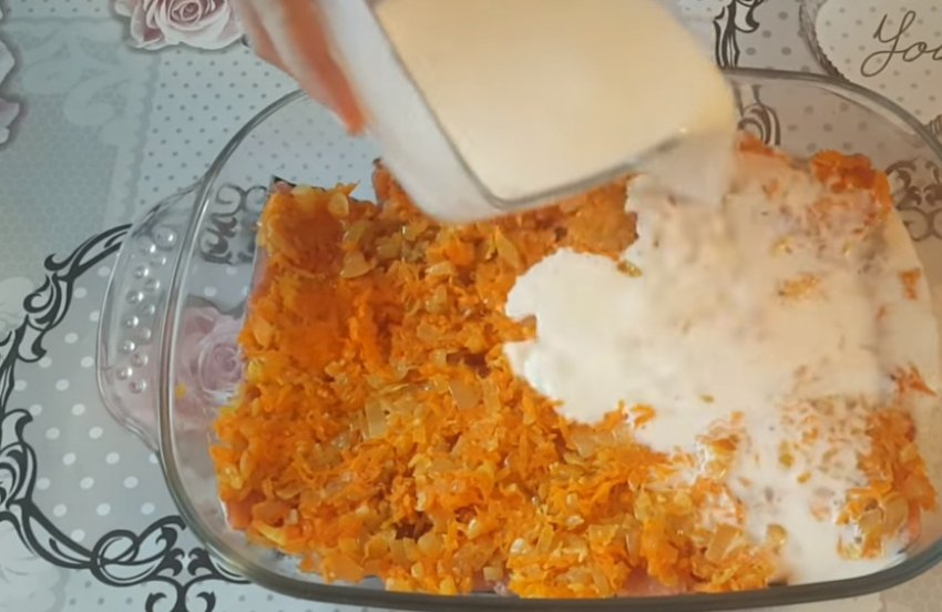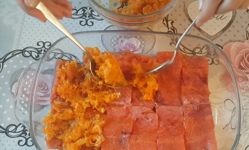 Викласти в ємність інгредієнти шарами: знизу - шматочки філе, зверху - зажарка з овочів.![]()