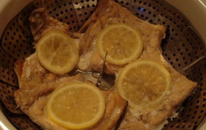 - Тим часом натріть горбушу сіллю і перцем, збризніть лимонним соком і викладіть у контейнер для парового готування. Встановіть його в мультиварку.