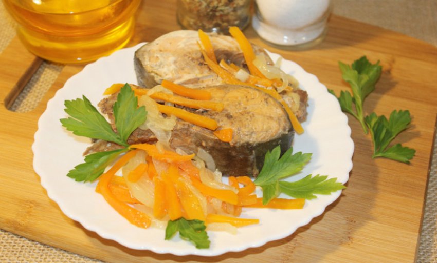 - Зверху на морквяно-цибулеву суміш викладіть рибу і додайте воду.