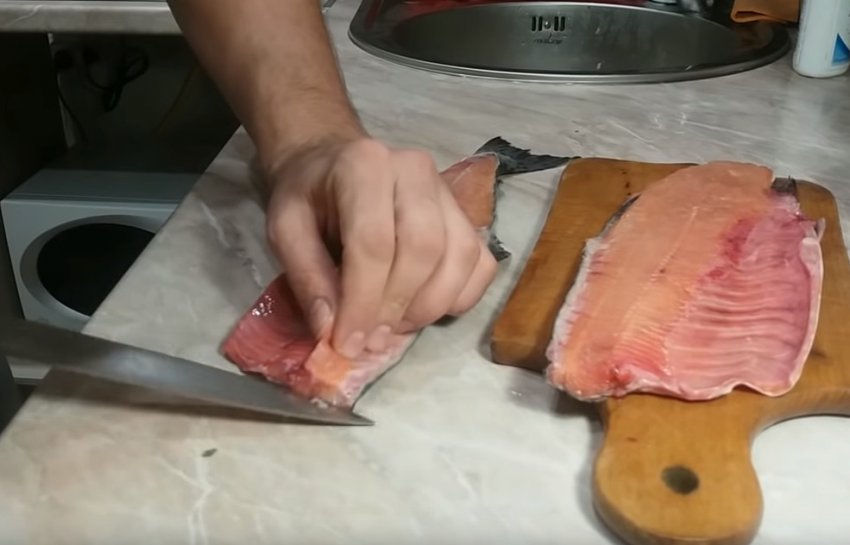 ножем зрізати філе, акуратно відокремлюючи м'якоть від хребта. Видалити всі кістки, зрізати бічні плавники і верхню шкірку гострим тонким ножем.![]()