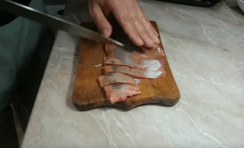 - Нарізати кожну з отриманих частин тушки невеликими скибочками.