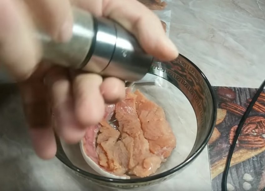 невелику суху миску, викласти на її дно шар горбуші. Посипати скибочки меленим чорним перцем, збризнути рослинною олією.![]()