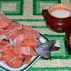 - Підготувати чистий, глибокий посуд. Викласти в нього шар горбуші, розміщуючи скибочки щільно одна до одної.