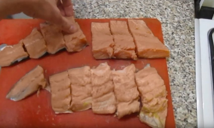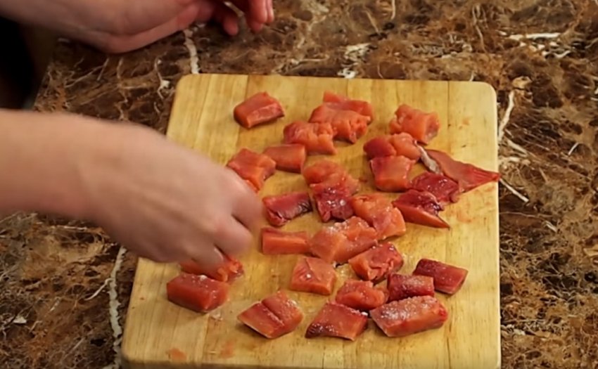 Заготовлені філейні частини під кутом поріжте на частки. Посоліть отримані заготовки і відправте в холодильник на 30 хв.![]()