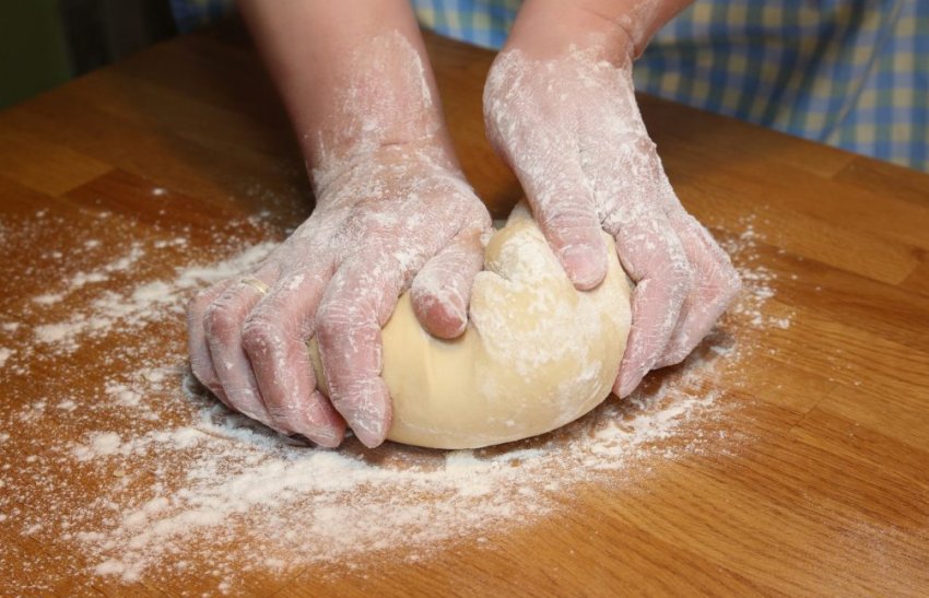 Замісити тісто. Для цього в ємність потрібно насипати борошно, вбити яйце, додати сіль і рослинну олію. Усе перемішавши, влити воду і додати ще борошна. Вимішати однорідне м'яке тісто. Укрити тісто плівкою і дати постояти близько години.![]()