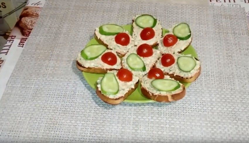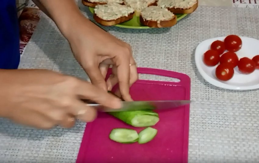 Викладають на кожну канапку по одному шматочку томата і по 1 шматочку огірка.![]()
