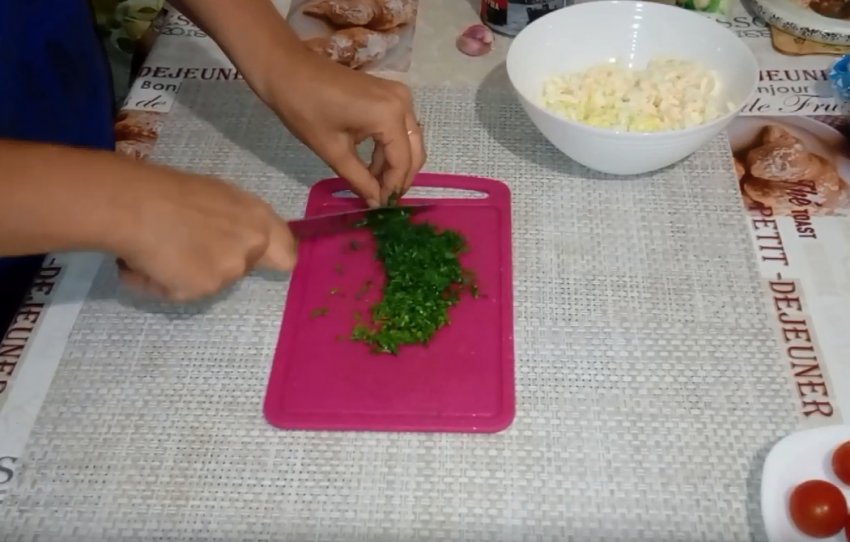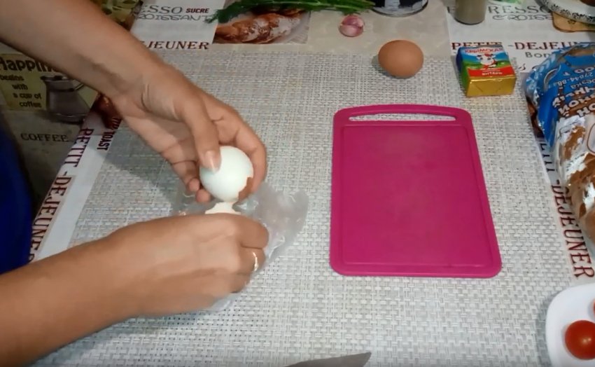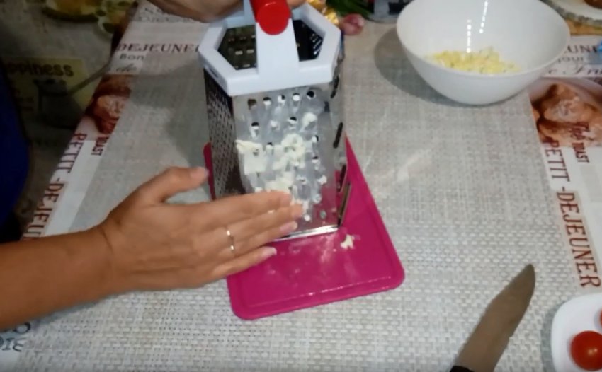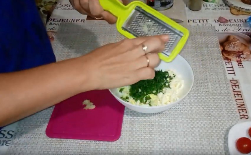 Яйця відварюють у підсоленій воді й очищають. Потім їх потрібно дрібно нарубати або натерти на середній тертці.![]()