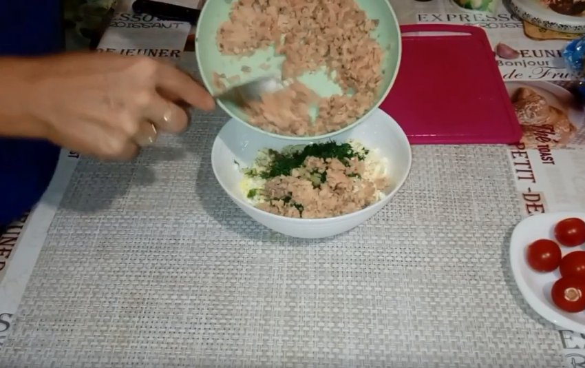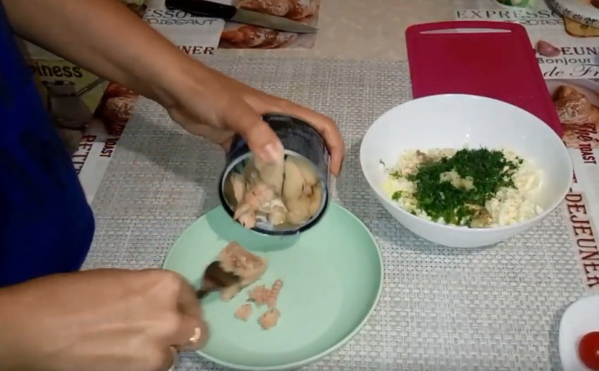 Відкривають консерви. Після чого горбушу викладають в окрему миску і очищають від дрібних кісточок, а потім подрібнюють виделкою до однорідності.![]()