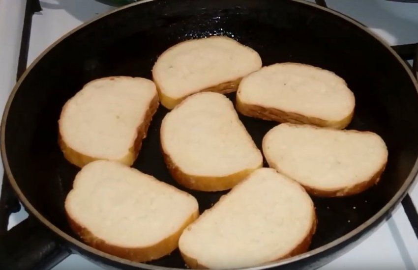 Нарізані скибочки білого хліба злегка обсмажують в олії. Дають охолонути 5 хвилин.![]()
