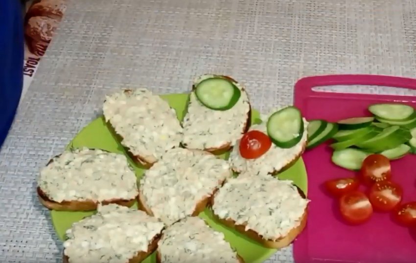 Рівномірно намазують їх бутербродною масою. Миють і нарізають невеликими скибочками томати й огірок.![]()