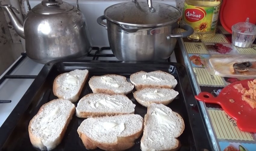 Хліб нарізають на шматочки. Намазують кожен із них тонким шаром вершкового масла. Духовку розігрівають до +150-180°С. Деко змащують рослинною олією і викладають на нього підготовлений хліб.![]()