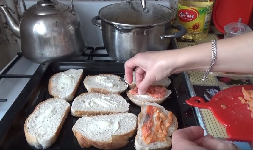 Поверх кожного тосту укладають горбушу рівномірним шаром.![]()