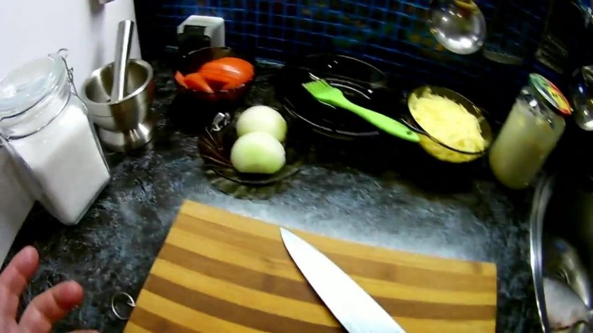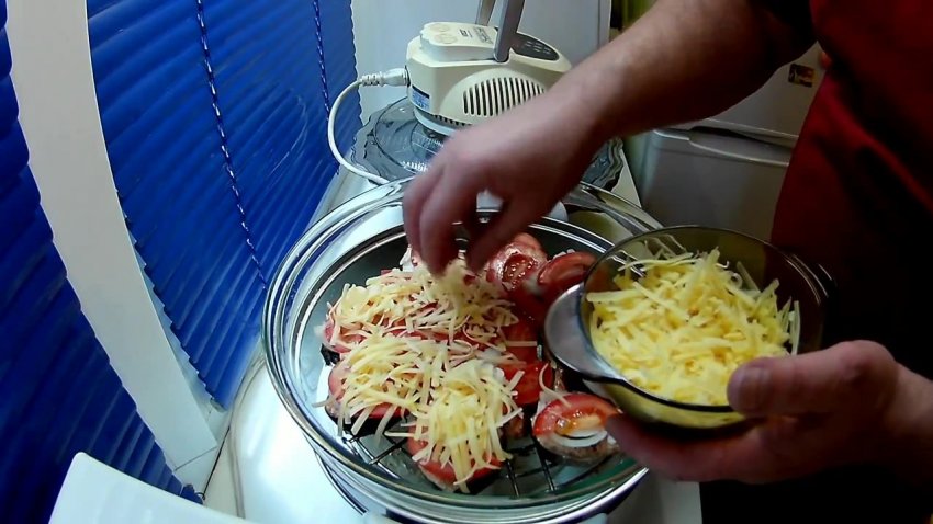 овочі, очистити цибулини від лушпиння. Нарізати цибулю тонкими півкільцями, а помідор - невеликими скибочками. Сир натерти на крупній тертці.![]()