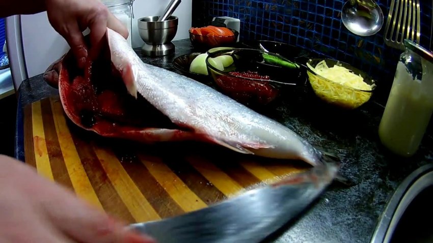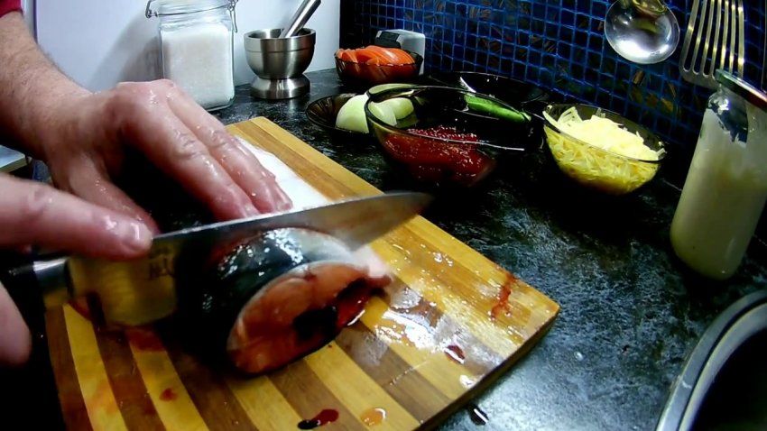 промити, видалити нутрощі. Відрізати голову, плавники та хвіст.![]()