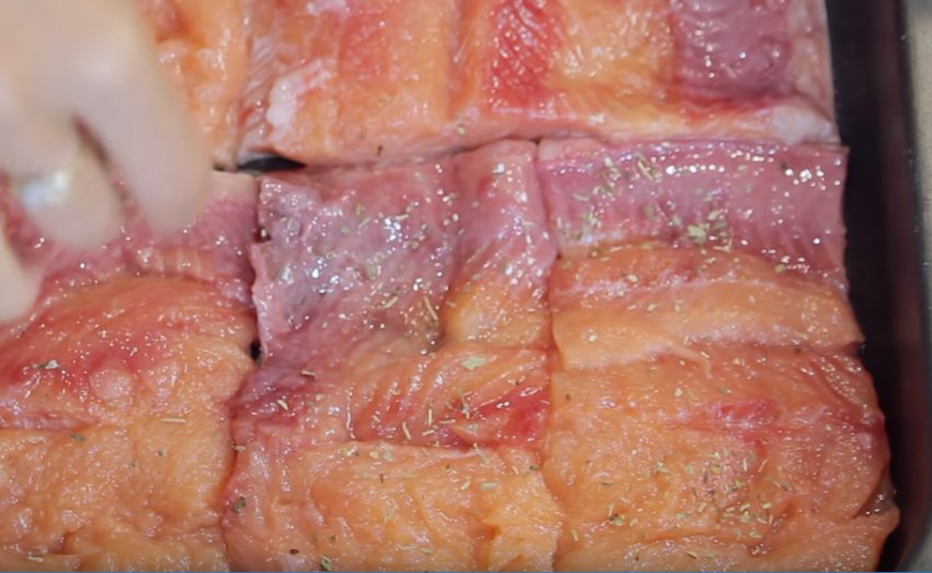 Посоліть і поперчіть головний інгредієнт, а також посипте спеціями, наприклад, прованськими травами.![]()