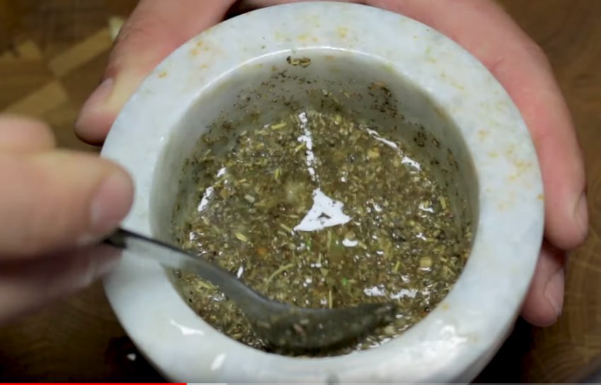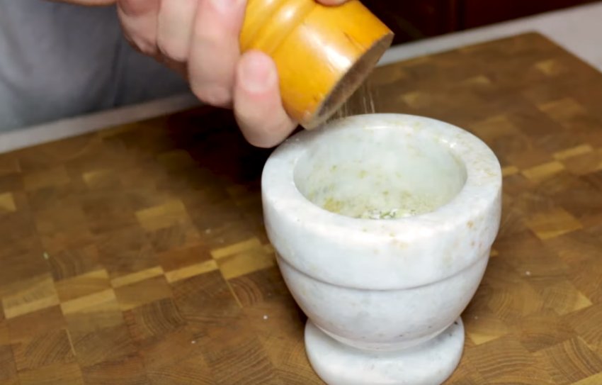 Змішайте в окремій ємності всі перераховані спеції з пропущеним через прес часником. До спецій необхідно видавити сік із розкатаного лимона. Якщо в ароматний маринад потрапили кісточки, то обов'язково вийміть їх.![]()
