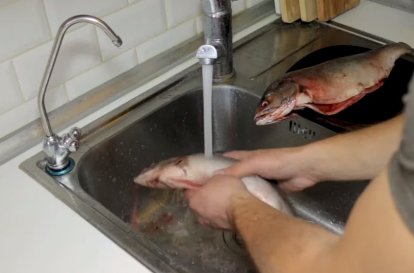 Ретельно промийте рибу під сильним струменем проточної холодної води.![]()