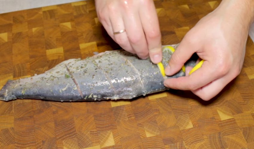 Зробіть на одній зі сторін кожної риби по 5 глибоких надрізів (до хребта), які необхідні для того, щоб тушки краще замаринувалися. Крім цього, туди будуть вставлені часточки лимона, необхідні для надання страві більшої привабливості, а також для удосконалення смаку.![]()