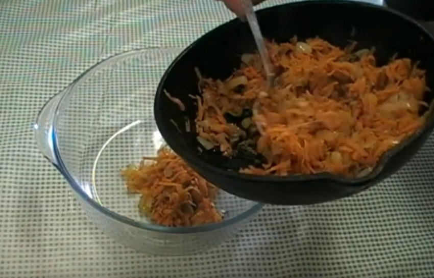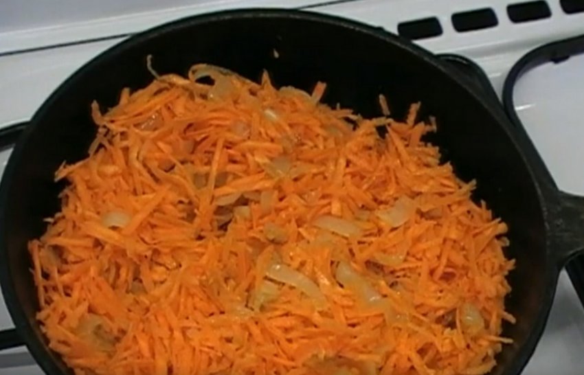 Моркву натріть на крупній тертці і відправте в сковороду до цибулі.![]()