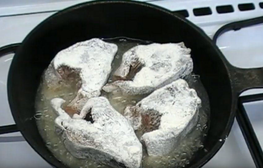 Обваляйте горбушу в борошні та обсмажте її на сковорідці, до утворення рум'яної скоринки.![]()