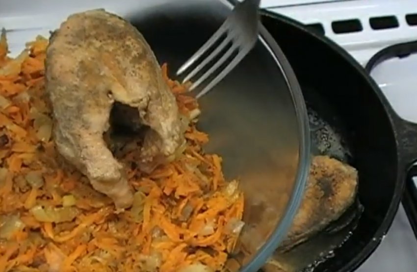 Викладіть рибу у форму на шар цибулі з морквою.![]()