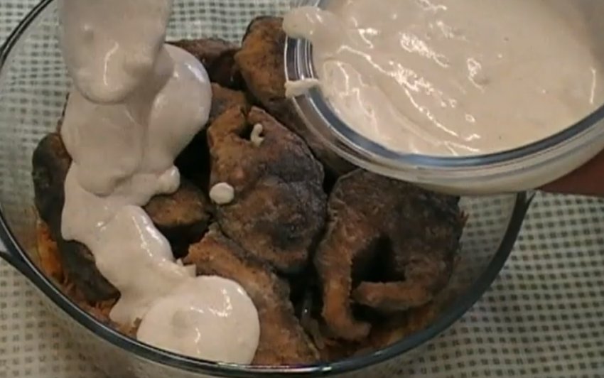 Приготуйте гірчичну заливку. Для цього змішайте в окремій ємності сметану, гірчицю та соус. Усі компоненти добре перемішати і залити приготовленою вершковою сумішшю горбушу.![]()