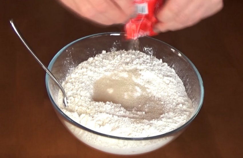 Борошно просіяти, додати дріжджі, перемішати.![]()