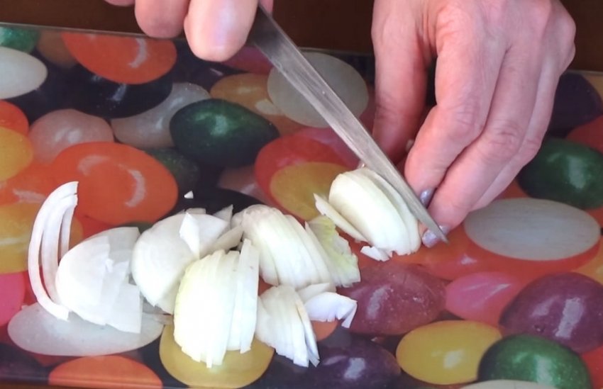 Подрібнити тонкими півкільцями ріпчасту цибулю.![]()