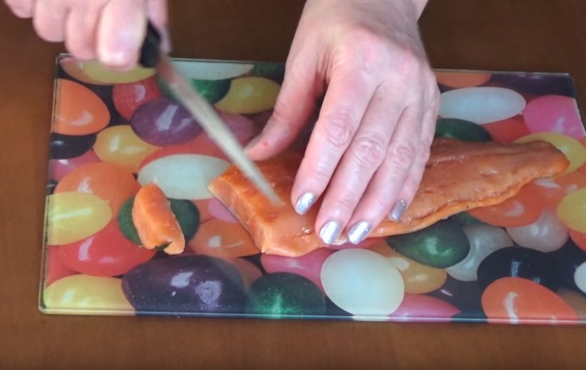 Філе горбуші нарізати невеликими шматочками, заправити 100 г майонезу.![]()
