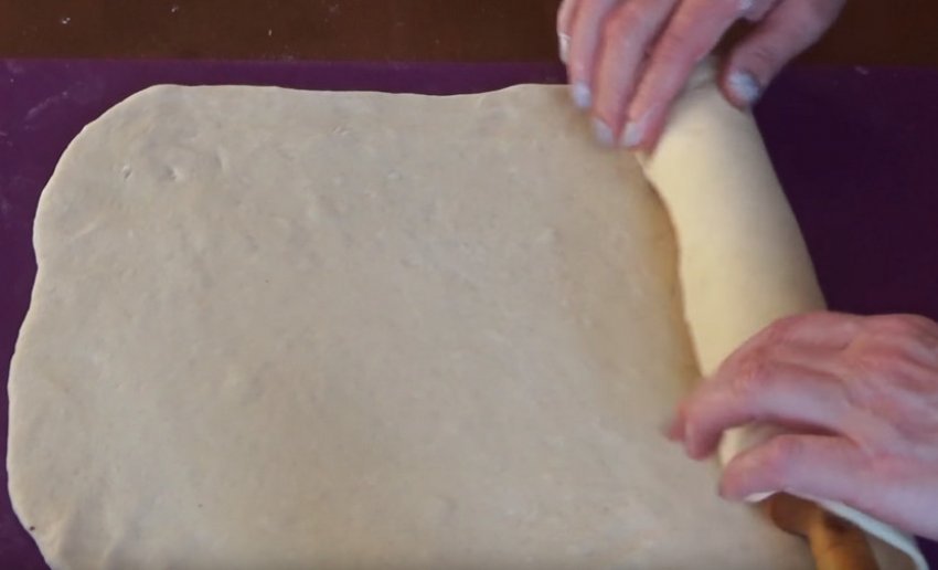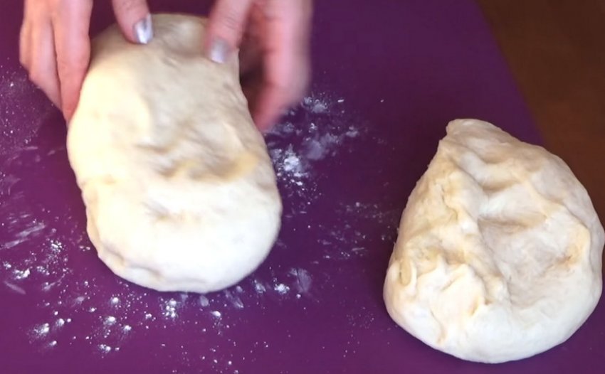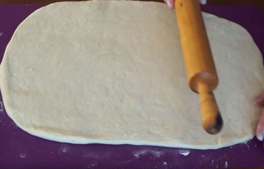 Більшу половину розкласти на дошку, злегка присипати борошном і розкачати товщиною близько 1,5-2 см.![]()