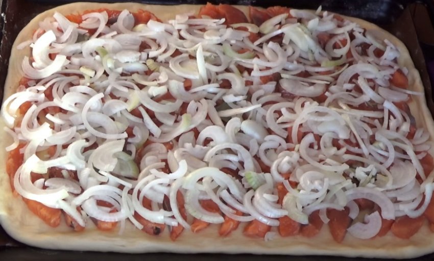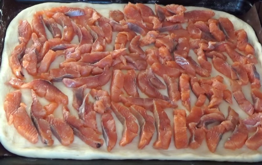 Викласти заготовку на деко, попередньо змащене соняшниковою олією. На тісто помістити рибу, рівномірно розподіливши шматочки по всій поверхні. Посолити, поперчити, розкласти лавровий лист.![]()