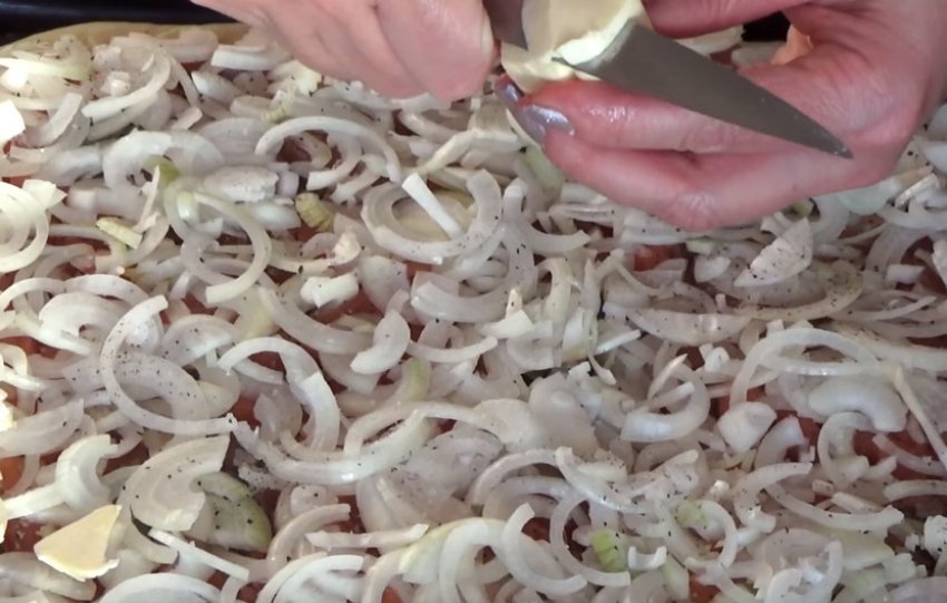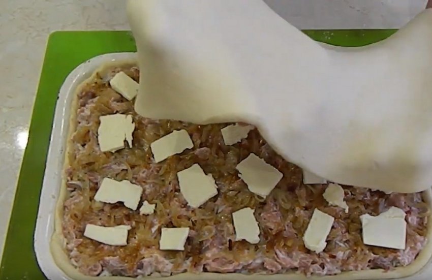 Поверх цибулі рівномірно розмістити шматочки вершкового масла, які додадуть соковитості начинці.![]()