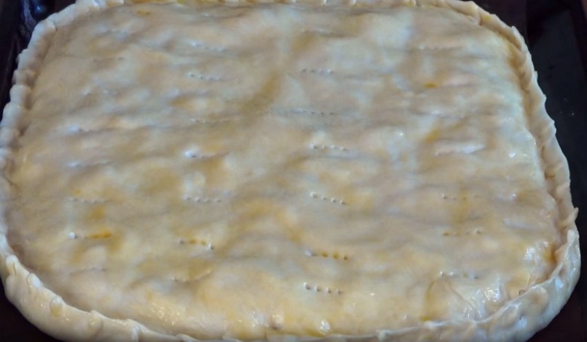 Розкачати другу (меншу) частину тіста більш тонким шаром, накрити ним пиріг і щільно защипнути краї.![]()