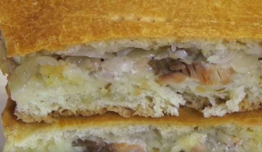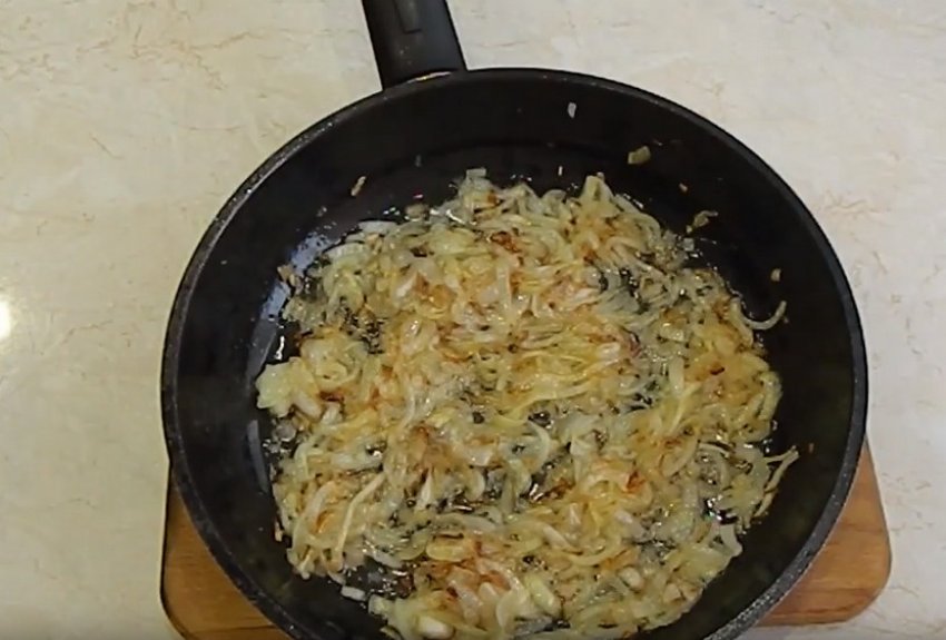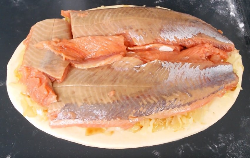 Цибулю нарізати півкільцями, злегка обсмажити на олії, остудити і розподілити на рибі. Додати сіль, перець. На самий верх начинки викласти нарізане невеликими фрагментами вершкове масло.![]()